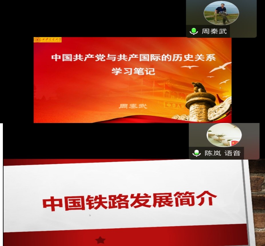 支部党员周秦武老师和陈岚老师分别向大家做了题为“中国共产党与共产国际的历史关系”以及“中国铁路发展简史”的报告,分别追溯了中国共产党的起源以及从经济角度-中国铁路发展史,来了解中国的百年巨变。