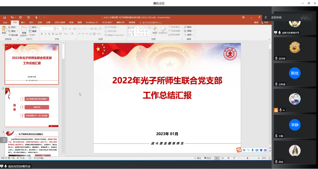 首先,支部书记翁国军总结2022年光子所师生联合党支部工作情况。翁国军书记重点汇报了本支部2022年“三会一课”开展情况、党建业务双融双促、微党课、我为师生办实事这三个亮点工作,以及支部学习教育工作情况,并初步介绍了2023年度的工作计划。翁国军表示,全体师生党员要进一步深入学习党的二十大精神,以党建引领推动业务发展,扎实推进支部建设。