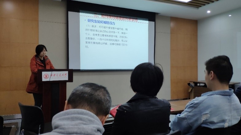马玉菲发言为所有师生讲解如何保持健康的科研状态。她从寻求专业的心理健康咨询出发总结道,当前研究生主要压力来自于学业压力、就业压力等,并提出饭后散步、自我对话、坚持运动、结合放松调节和想象调节等方法缓解压力。